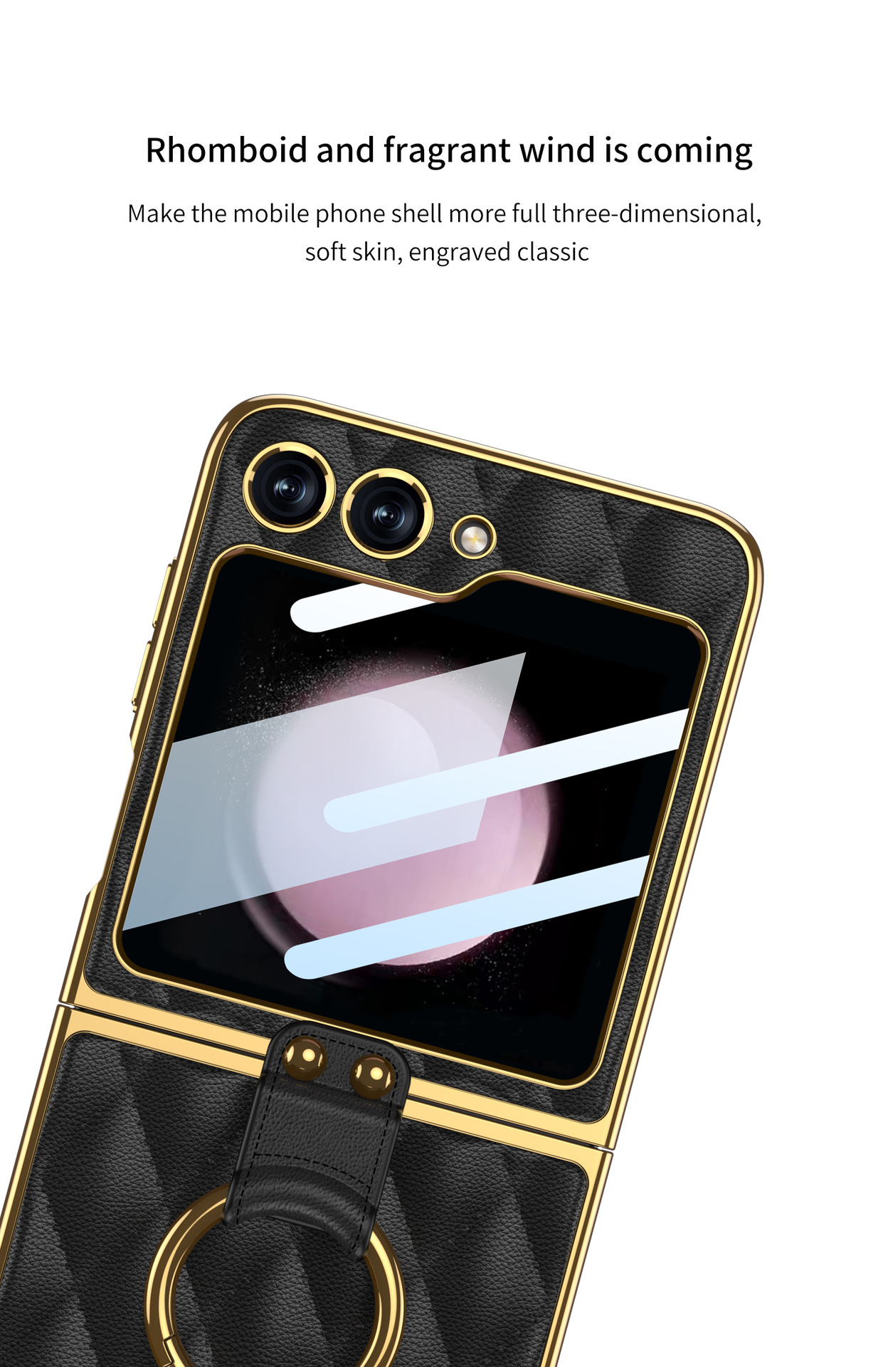 Luxury Argyle Leather Phone Case with Ring and Front Screen Protector For Samsung Galaxy Z Flip5