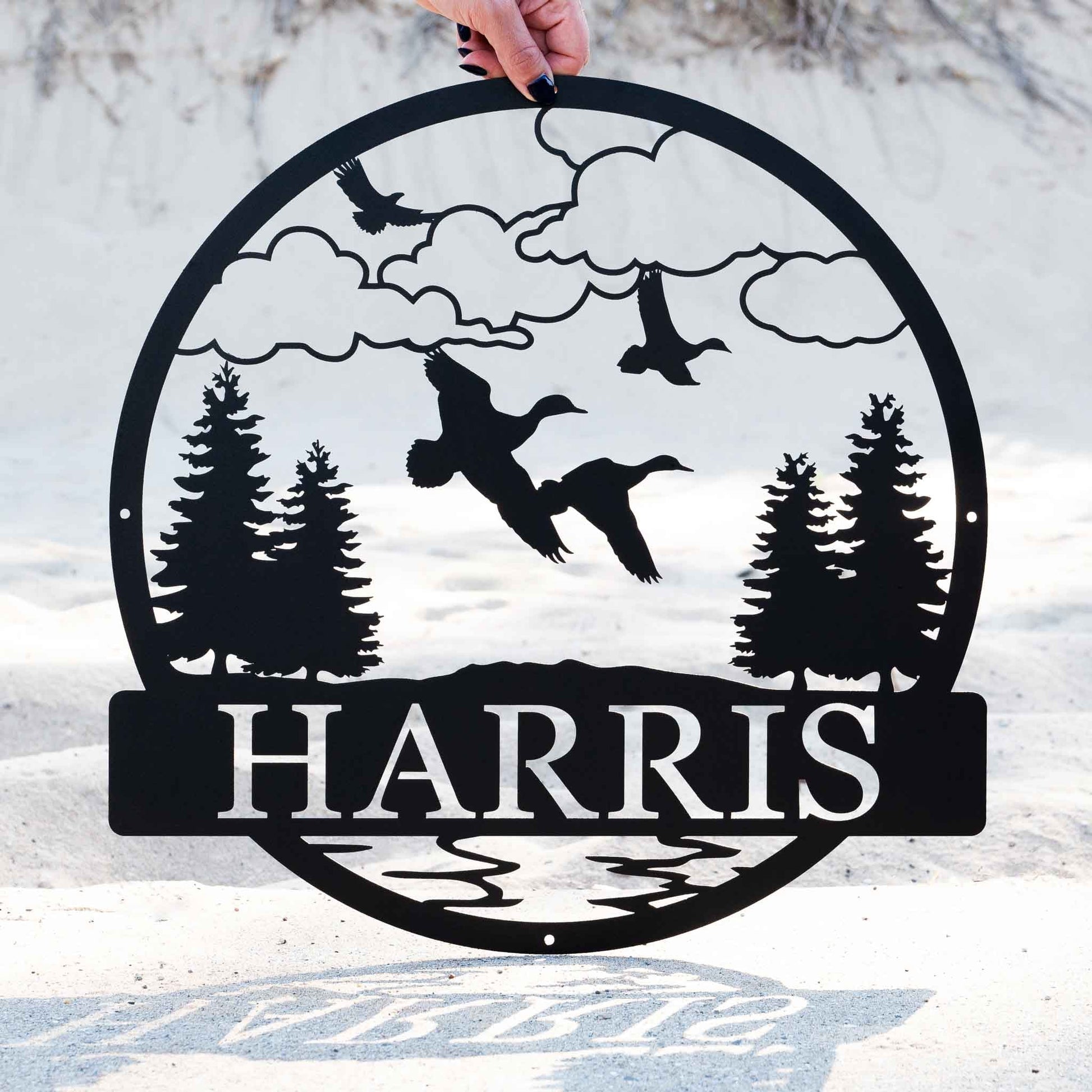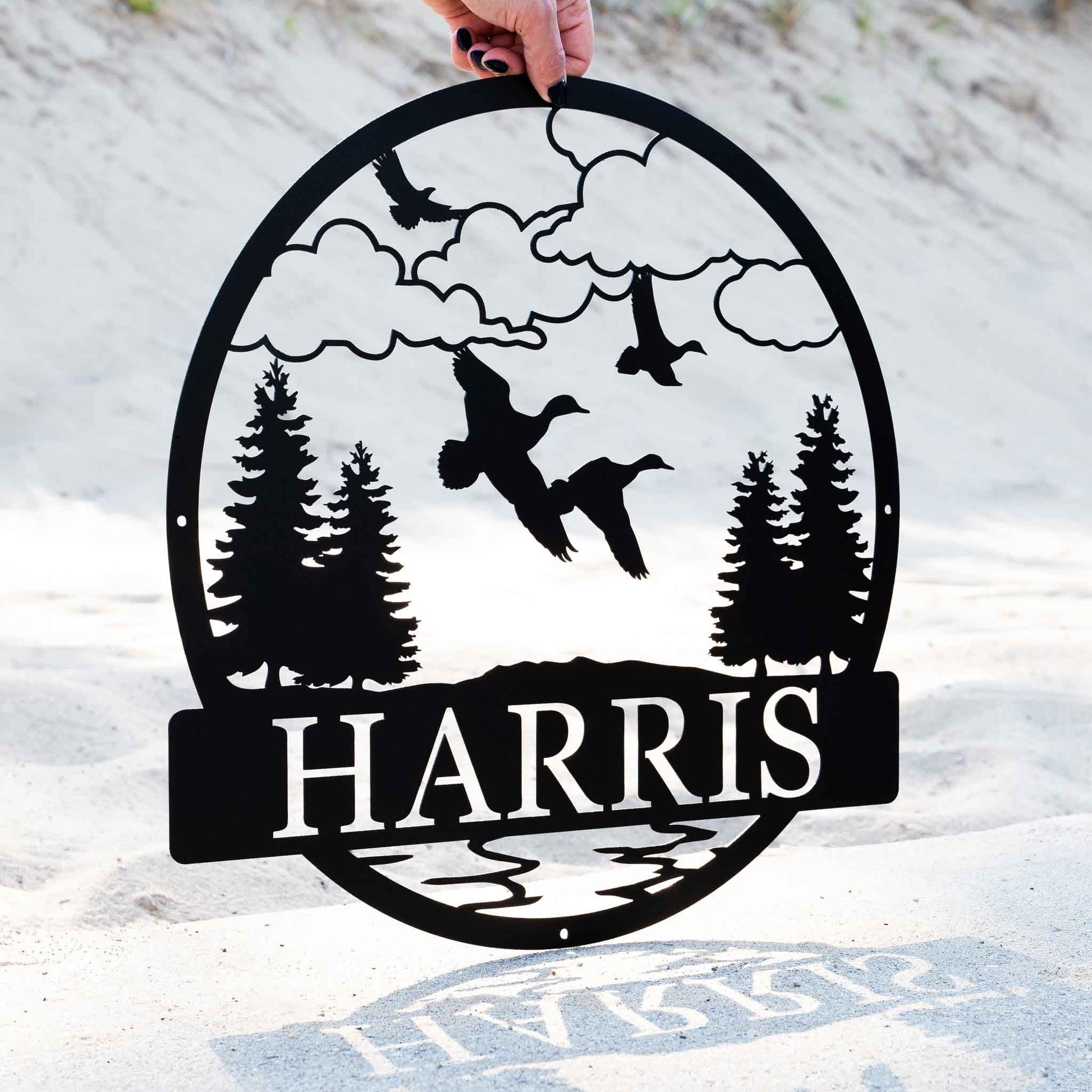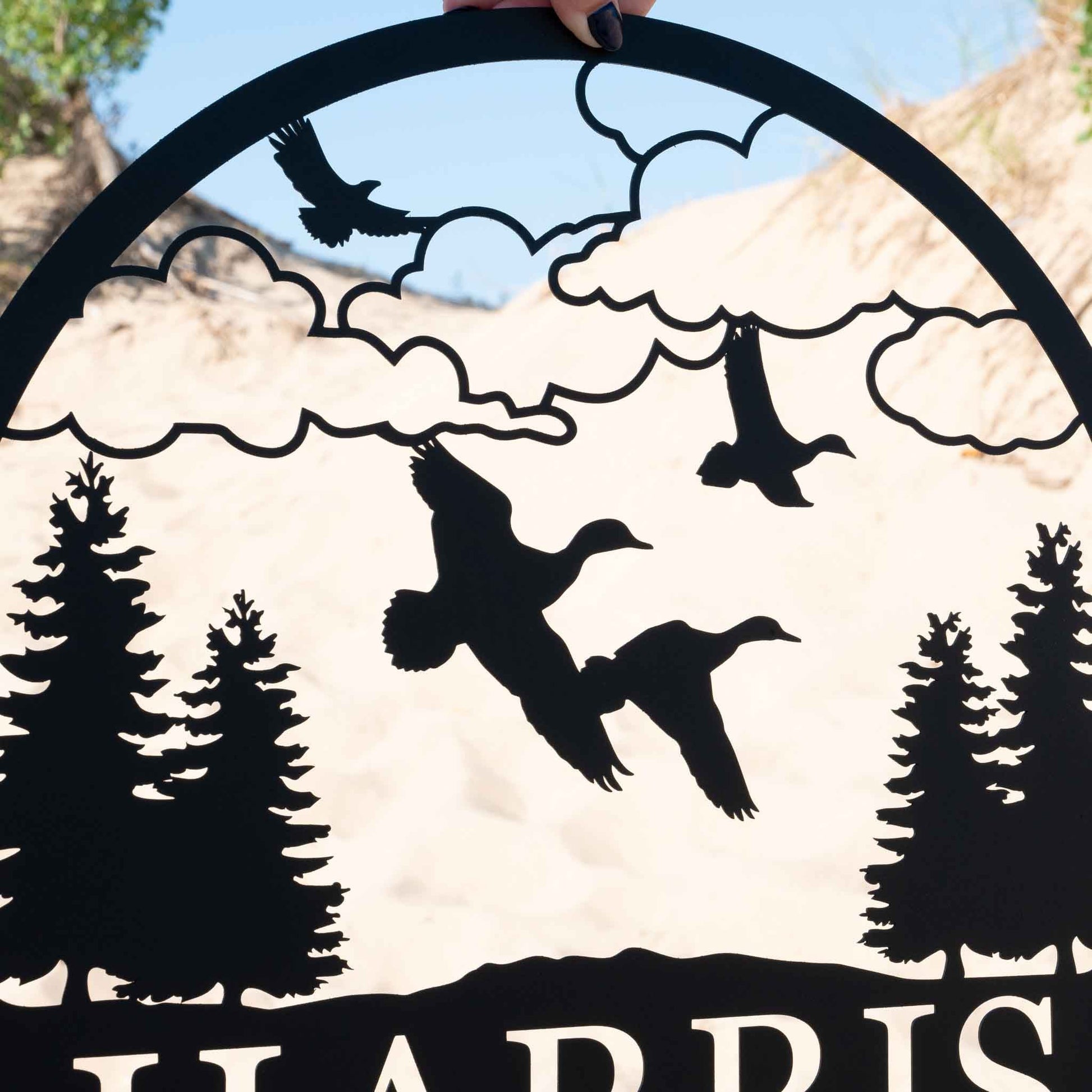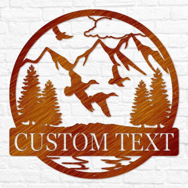 Bring the beauty of the outdoors to your space with our Duck Circle Name Sign, crafted from heavy-duty, premium quality steel. This stunning design features flying ducks soaring over a natural landscape between trees, available with a mountain or cloud background. Personalize it with your name, family name, or a custom phrase for a unique touch.