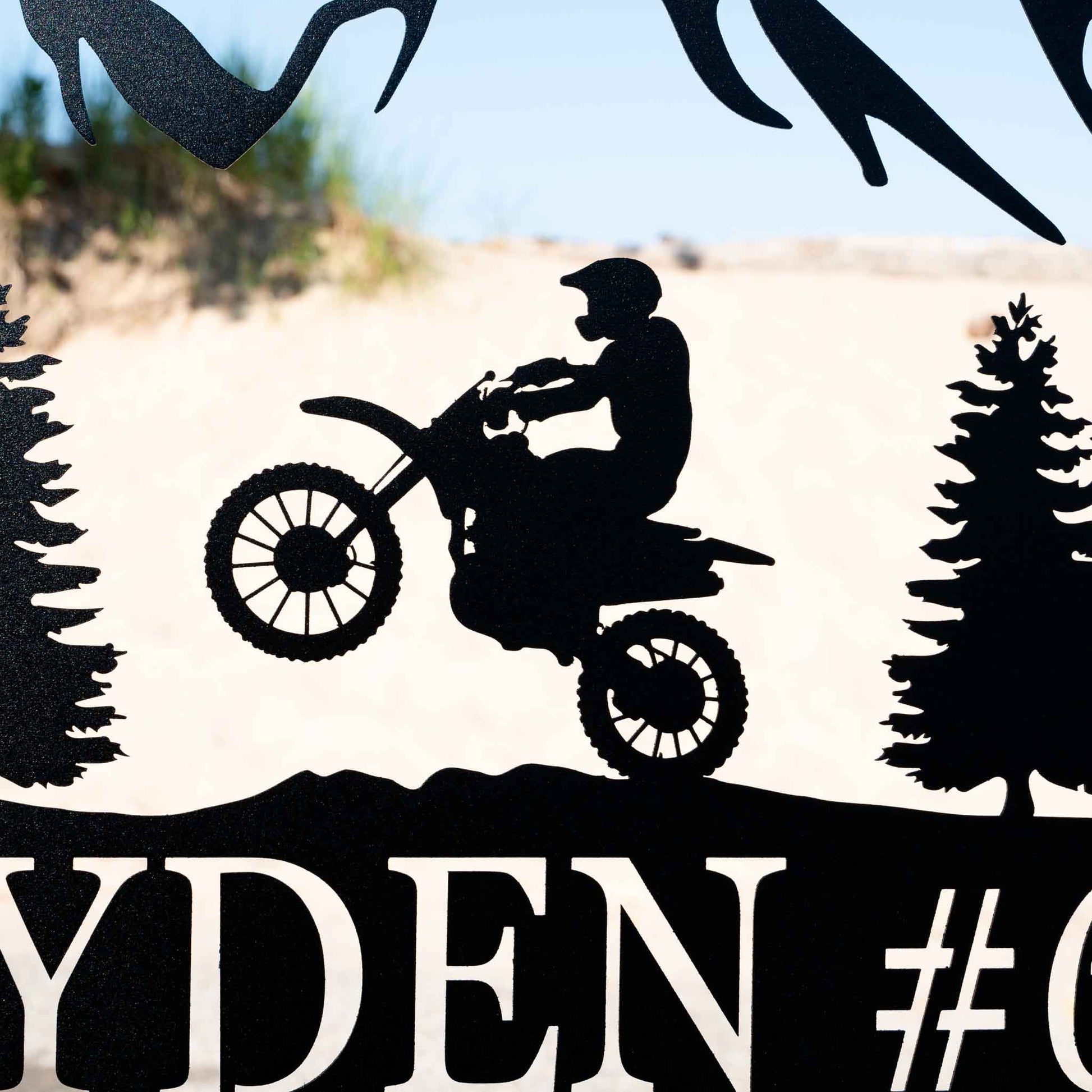 Rev up your space with our Personalized Dirt Bike Name Sign, crafted from heavy-duty, premium quality steel. Featuring a dynamic dirt bike rider in action, this custom sign is available with your choice of Clouds or Mountains background for the ultimate adrenaline-fueled look. Whether mounted in a garage, trackside, or at home, this sign adds bold motocross energy anywhere. Available in a variety of sizes and weather-resistant finish colors including matte black, matte copper vein, translucent red, translucent blue, and translucent copper.