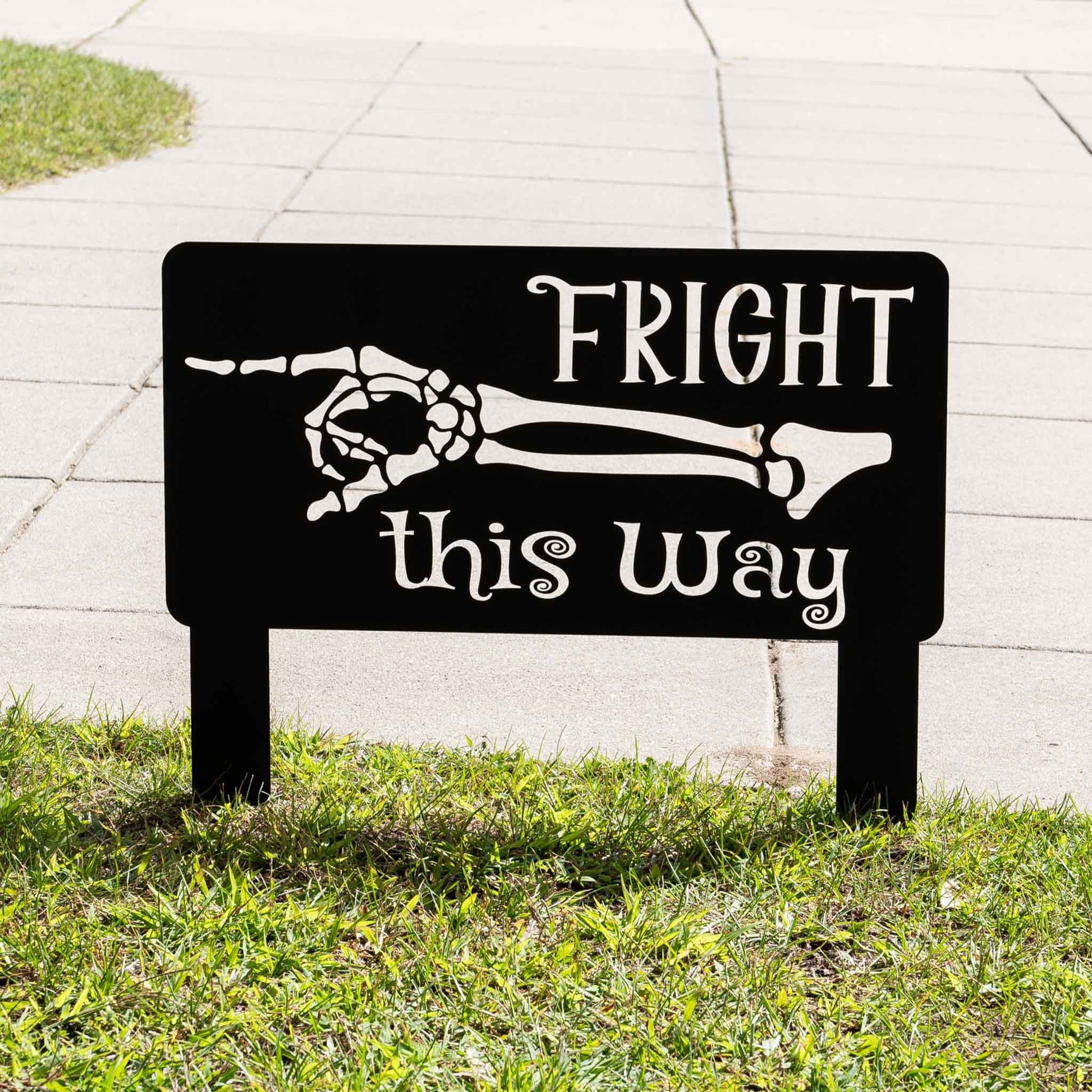 Designed to withstand outdoor elements, this Halloween yard sign is ideal for front yards, porches, pathways, or haunted trail setups. Its eye-catching design makes it a perfect addition to your Halloween decorations, creating a chilling atmosphere that guides trick-or-treaters or party guests straight to the fun. With its durable steel construction and spooky skeleton hand silhouette, this "Fright This Way" sign ensures your Halloween display will stand out and be the talk of the neighborhood!