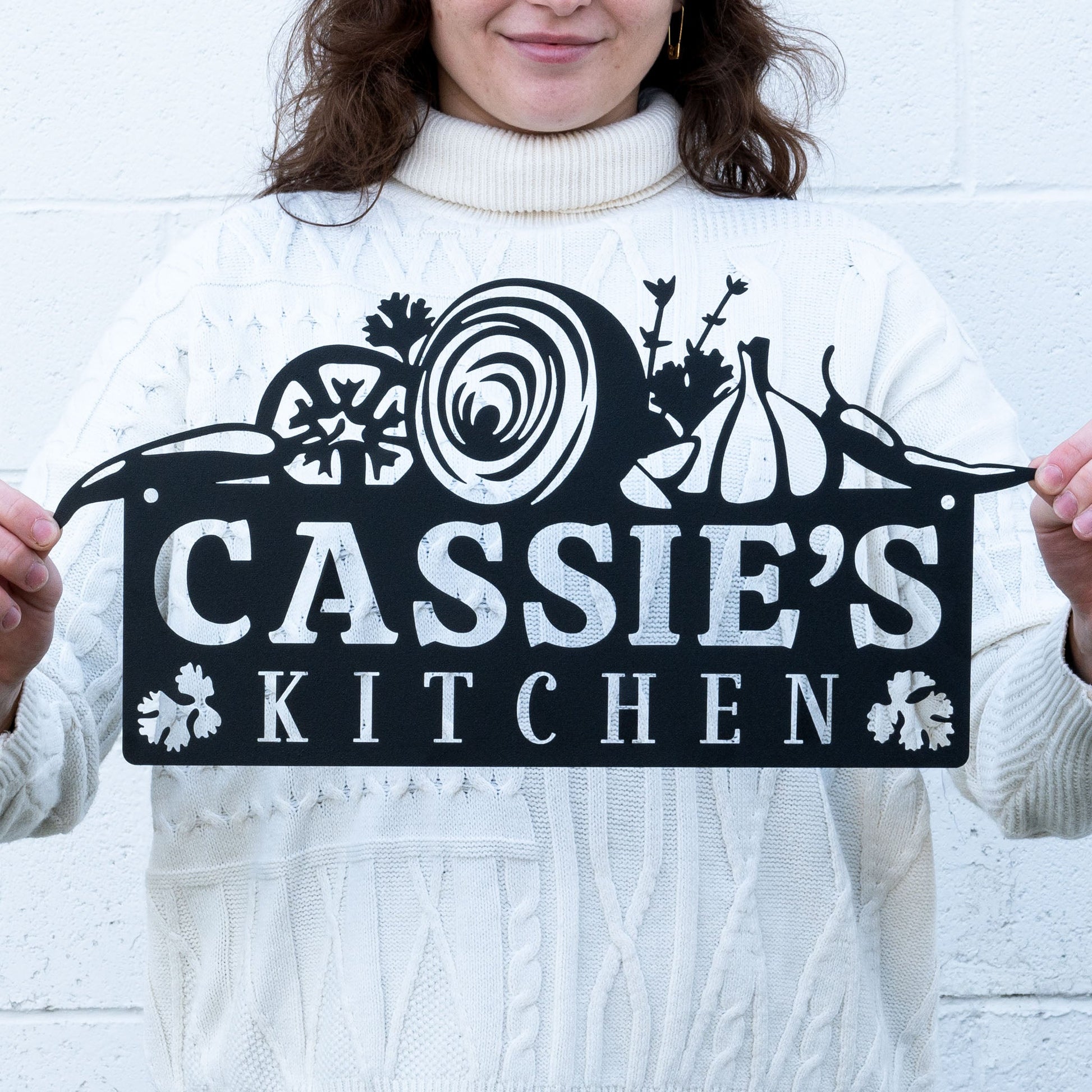 Personalize your space with this charming Metal Kitchen Name Sign, beautifully crafted from heavy duty, premium quality steel. Designed with delightful images of fruits and vegetables, this piece brings warmth and personality to any kitchen or dining area. Whether you're a passionate cook, a home chef, or simply love unique décor, this custom name sign adds a tasteful, rustic touch. It makes a thoughtful gift for weddings, housewarmings, or birthdays—and fits beautifully in everything from cozy farmhouse kitchens to modern culinary spaces. Available in a range of sizes and finished in weather resistant powder coated colors including matte black, matte copper vein, translucent red, translucent blue, and translucent copper, it’s made to suit your space and style.