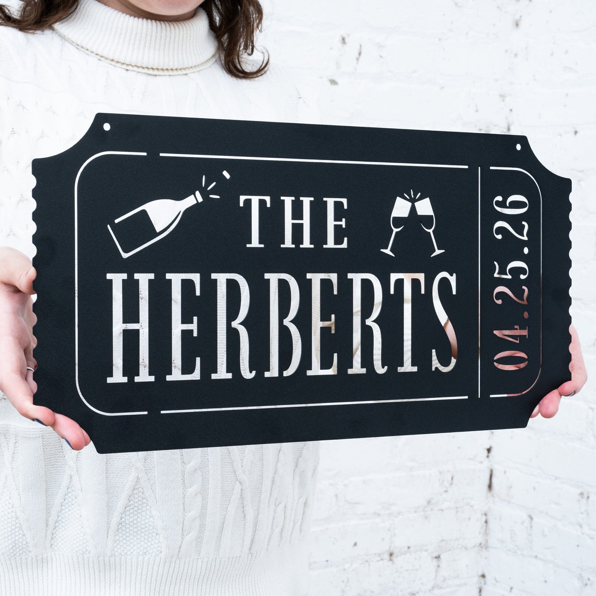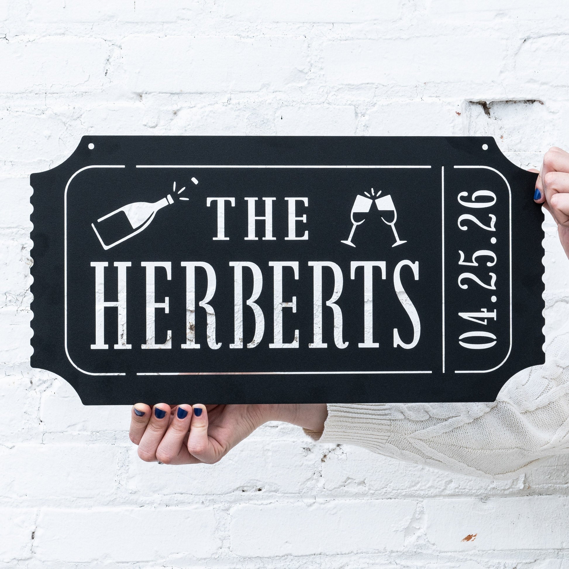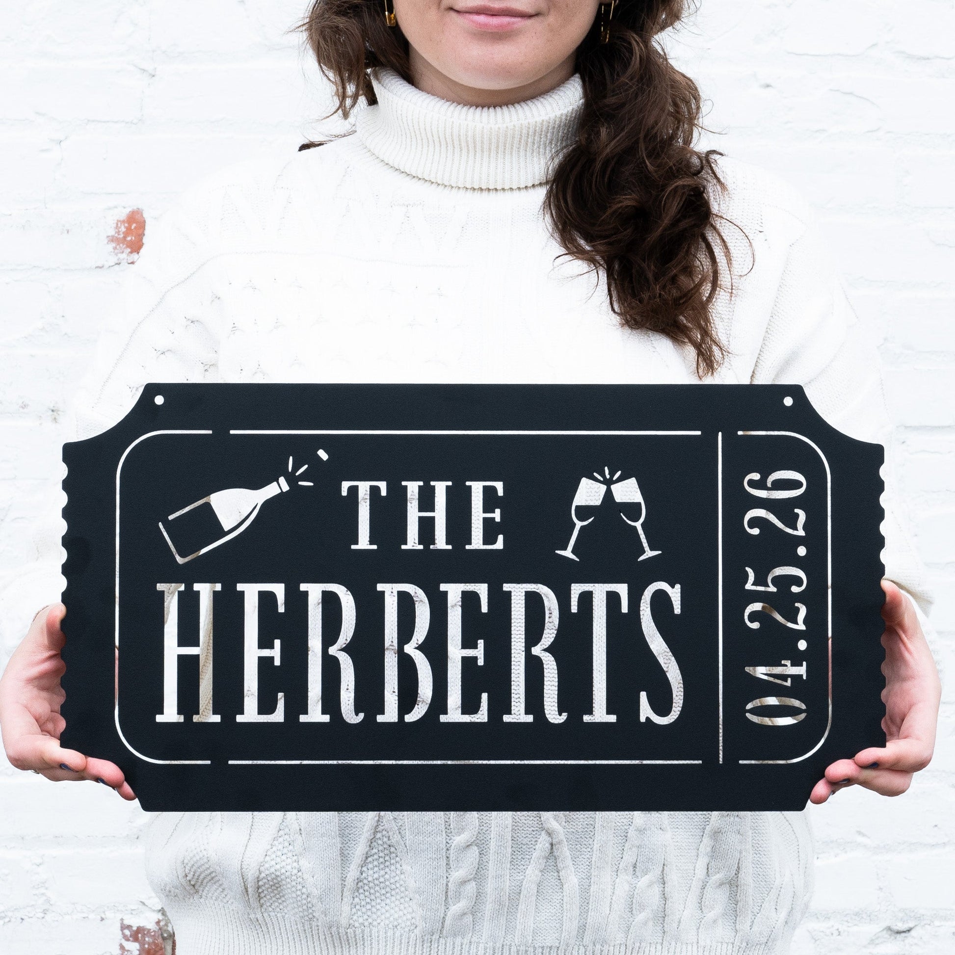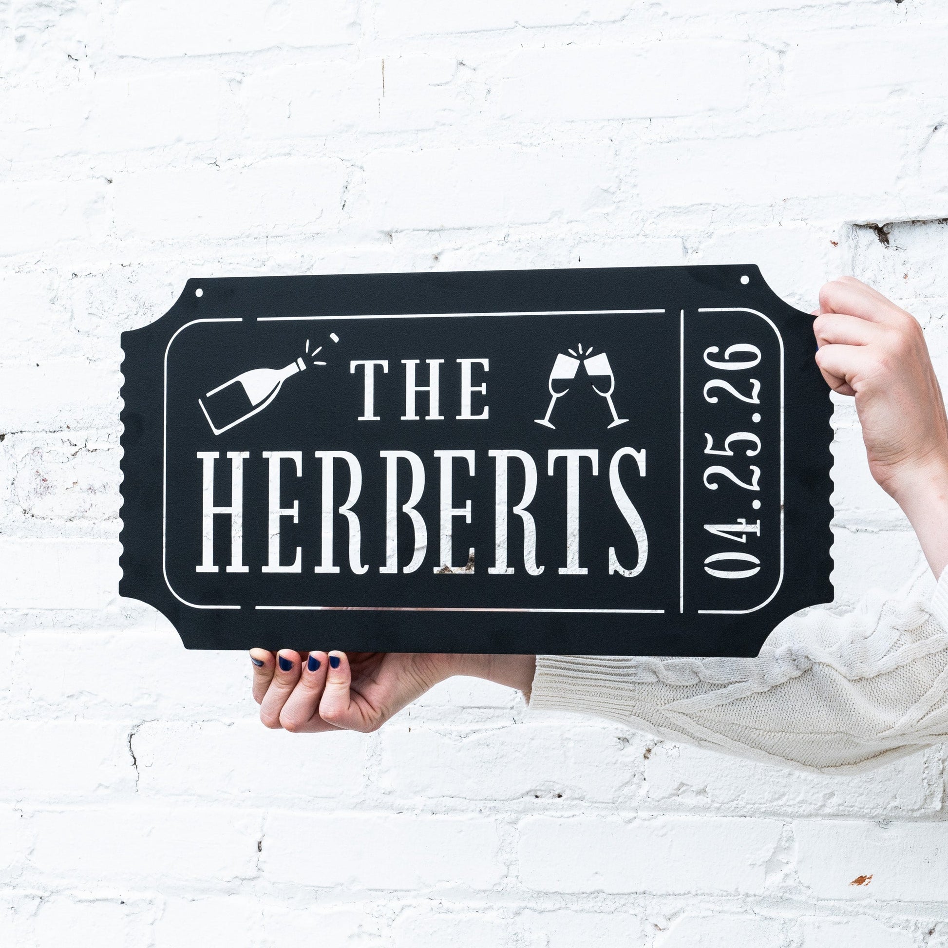 Celebrate your love story with this one-of-a-kind Wedding Ticket Stub Metal Sign, customized with the couple's names and special date. Styled to resemble a classic event ticket, this sign captures the excitement of your big day in a fun, creative way—perfect for displaying at weddings, receptions, or in your home as a lasting memento. Made from heavy duty, premium quality steel and finished with a weather resistant powder coating, it’s available in multiple sizes and your choice of matte black, matte copper vein, translucent red, translucent blue, or translucent copper. Whether you’re gifting it to a newlywed couple or commemorating your own milestone, this personalized sign is a heartfelt and stylish tribute to a day you’ll never forget.